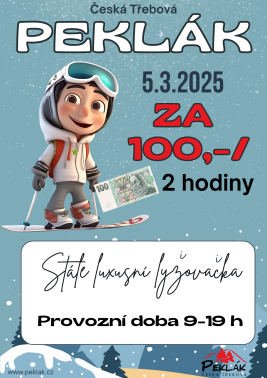 Ve středu 5.3. pro Vás máme parádní lyžování za skvělého počasí za úplně nejvíc nejlepší cenu. Jezdíme za 100 Kč na 2 hodiny. Provoz 9-19 bez přerušení.